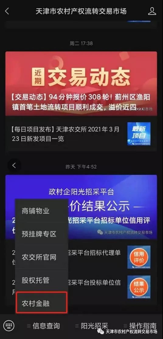 申请人也可通过手机登录天津农村产权交易所微信公众号“信息查询”→“农村金融”进行在线申请。